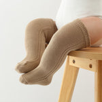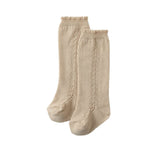 Over the knee high socks in a warm sand shade, featuring delicate openwork and a scalloped edge. Crafted from soft, stretchy cotton with reinforced toes and heels for durability. The elasticated top ensures they stay comfortably in place throughout the day. Made entirely from breathable cotton, they're perfect for warmer days. A charming little touch that adds something special to any outfit.