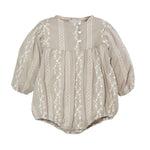 This long-sleeved baby romper is detailed with delicate embroidery and pearl-style buttons down the front, offering a refined, vintage-inspired look. Available in classic white or earthy brown, it’s designed for special outings, family gatherings, or days when you want something a little more polished. A timeless piece with subtle heirloom touches.