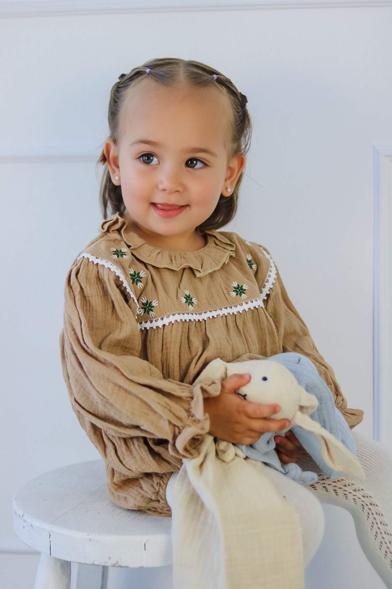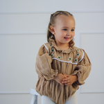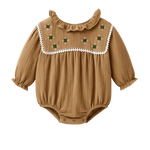 With vintage charm and Southwestern influences, our brown romper features embroidered details on the chest and ruffled collar and sleeves—bringing a stylish, nostalgic touch to any occasion.