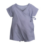 A wrap-style baby romper with soft side ties and a relaxed silhouette, made from a breathable linen-cotton blend. Available in light blue, beige, and olive, it’s a lightweight essential designed with comfort, movement, and quiet simplicity in mind.
