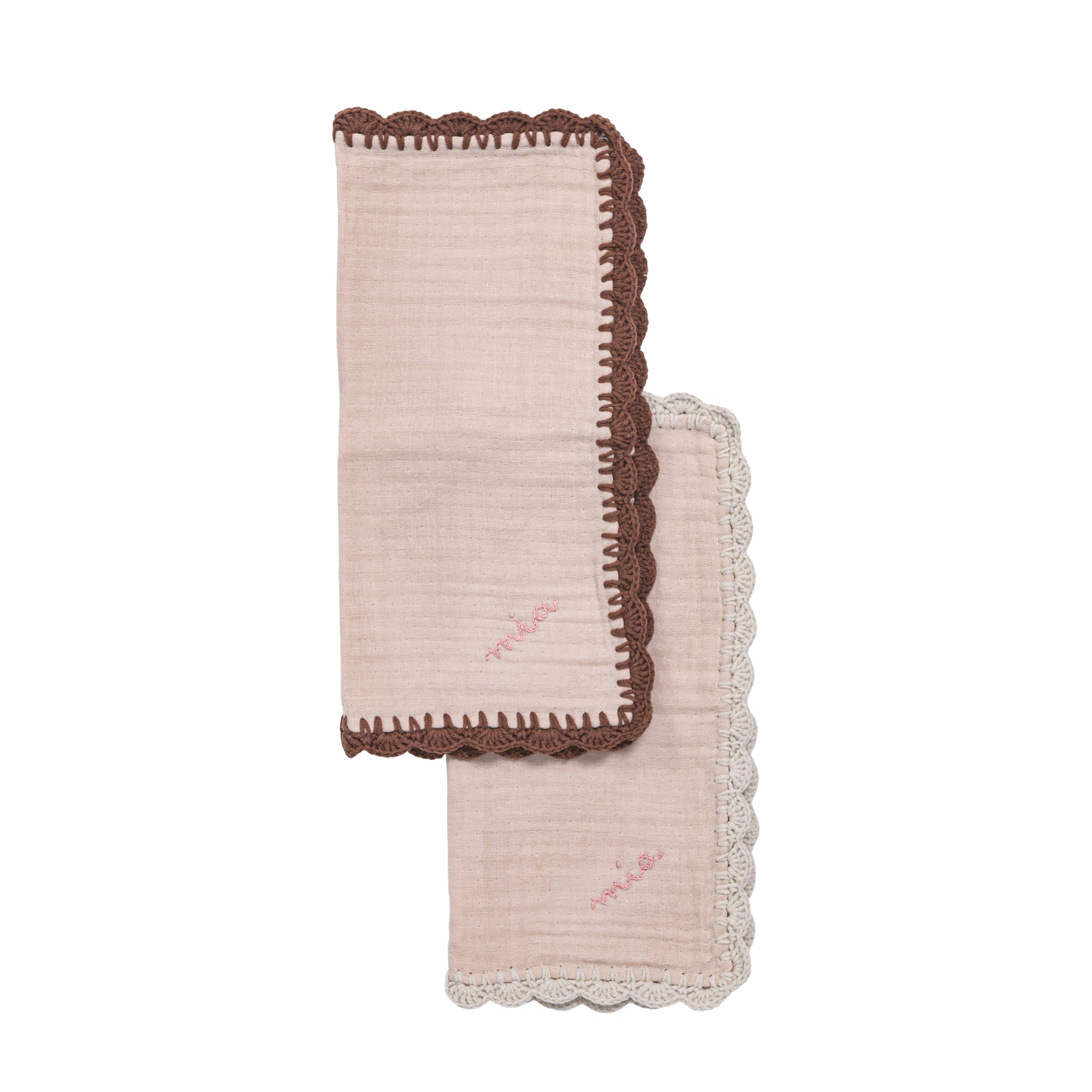 Soft muslin cotton and handmade crochet details — a set of 2 burp cloths, beautifully delicate and perfect for your little one.