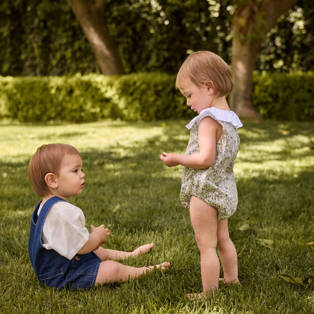 A timeless, gender-neutral romper in soft denim with the look of a classic overall. Designed with adjustable button straps and side button details for a flexible fit and easy dressing. Lightweight, practical, and perfect for sunny days, playtime, and everyday adventures.