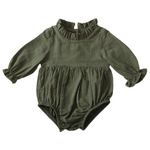 Opt for timeless elegance with our olive green romper, featuring a vintage-inspired ruffled collar. Simple yet charming, it’s ideal for family gatherings or special celebrations.