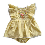 The Eve romper is crafted to resemble an elegant dress, featuring a delicate interplay of ruffles.