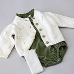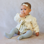These cardigans, in soft light beige and a muted blue-green, bring a touch of nature's serenity to your little one's wardrobe. With delicate knitted flowers on the outside, they add a sweet, whimsical charm to any outfit.