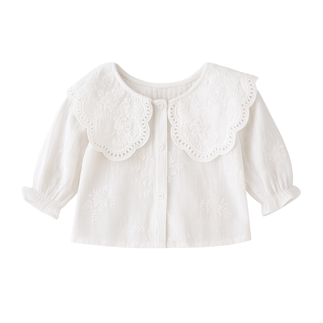 Dress your little one in this lightweight white blouse, featuring an enchanting Peter Pan collar with embroidered details, making it the perfect piece to let the collar shine beneath a cozy sweater.