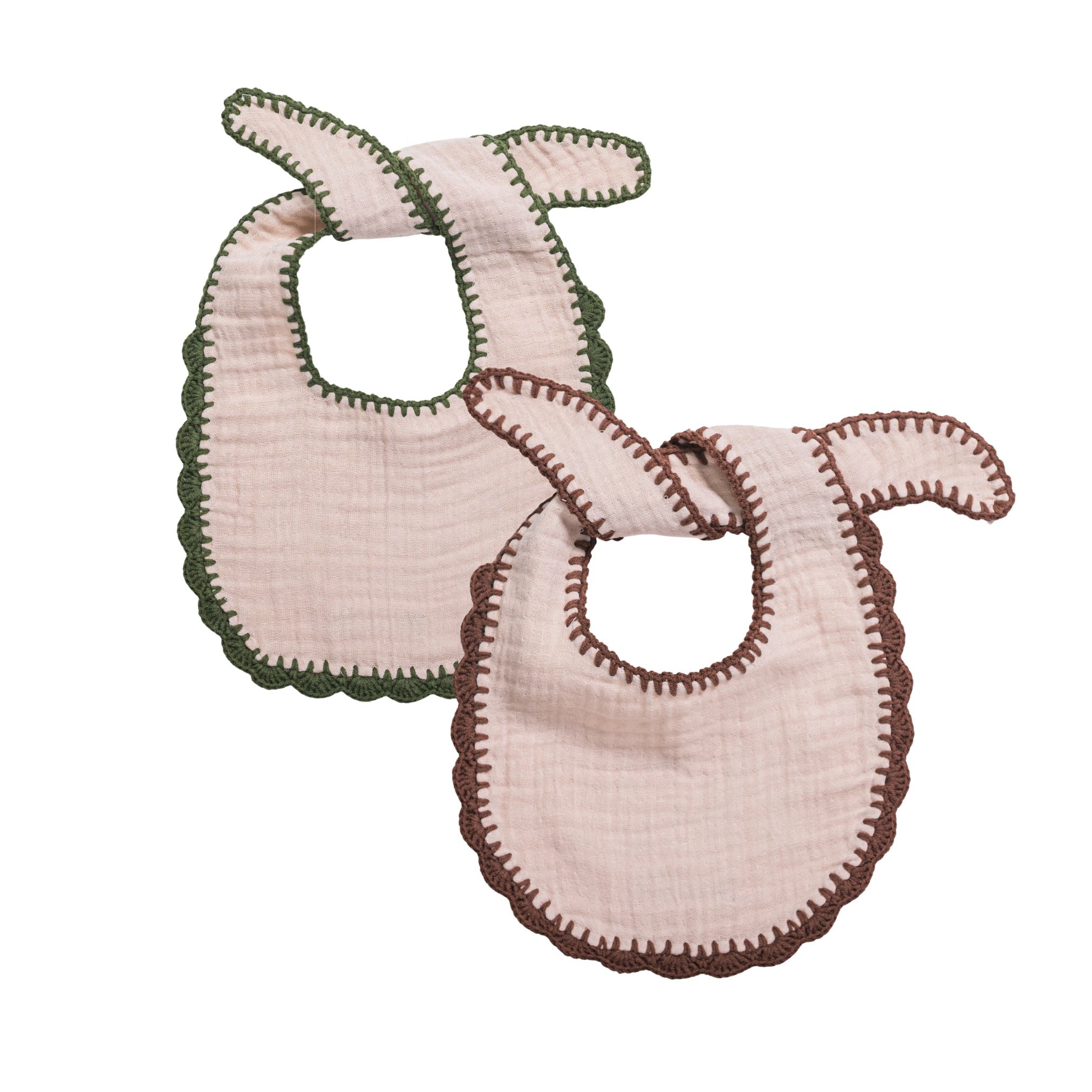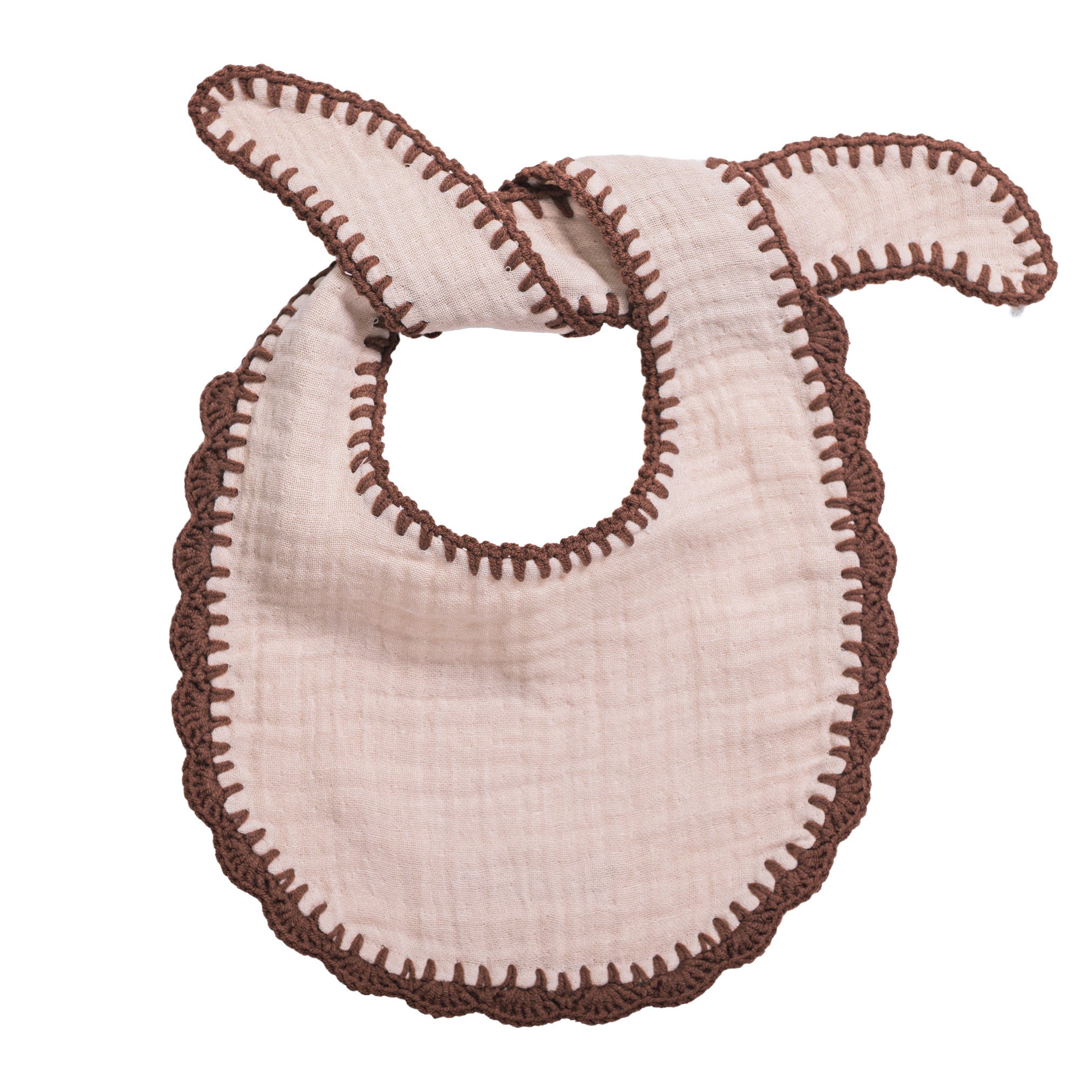 Soft muslin cotton, handmade crochet details, and the option for personalized hand embroidery — a bib made to be as special as your little one.