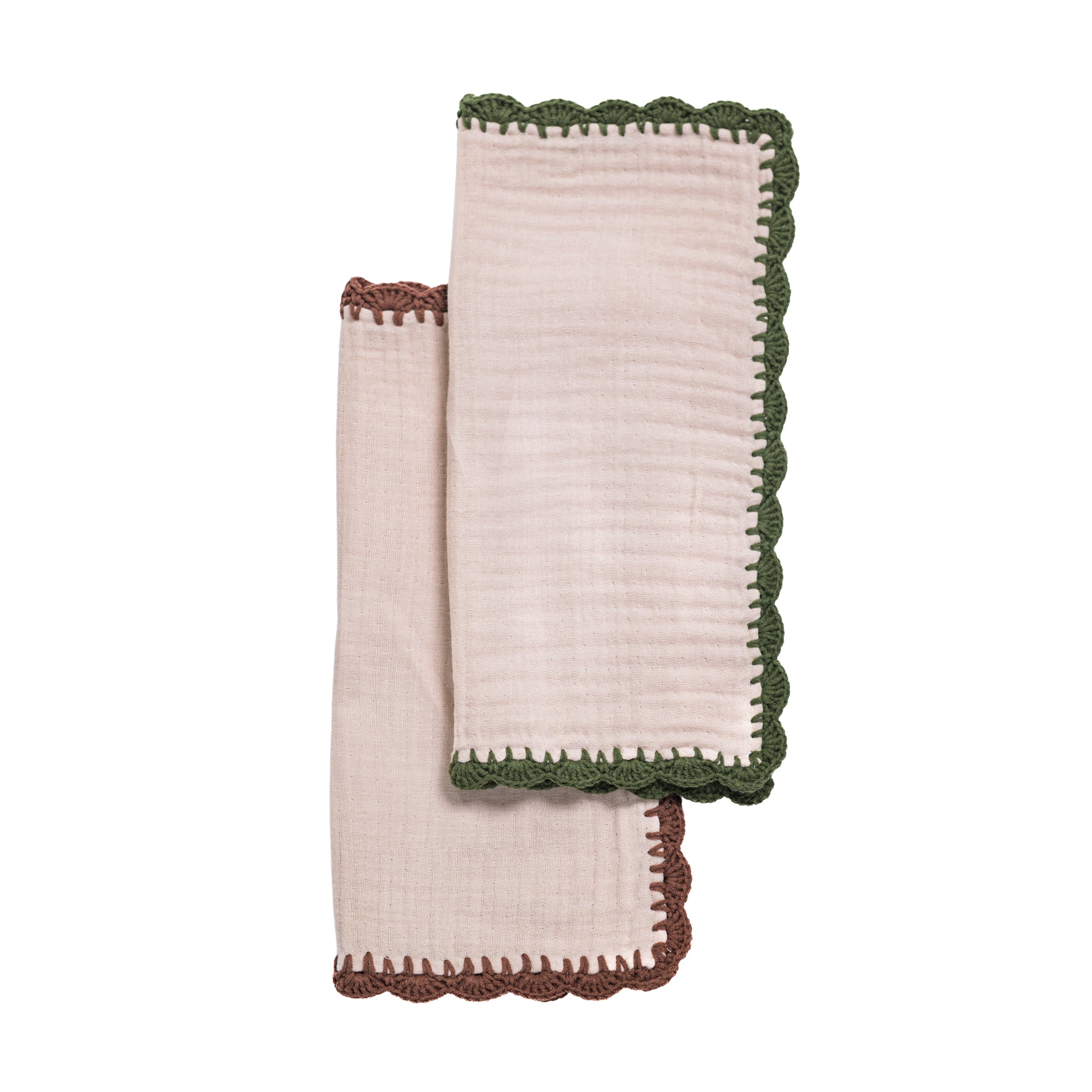 Soft muslin cotton and handmade crochet details — a set of 2 burp cloths, beautifully delicate and perfect for your little one.