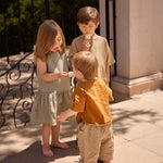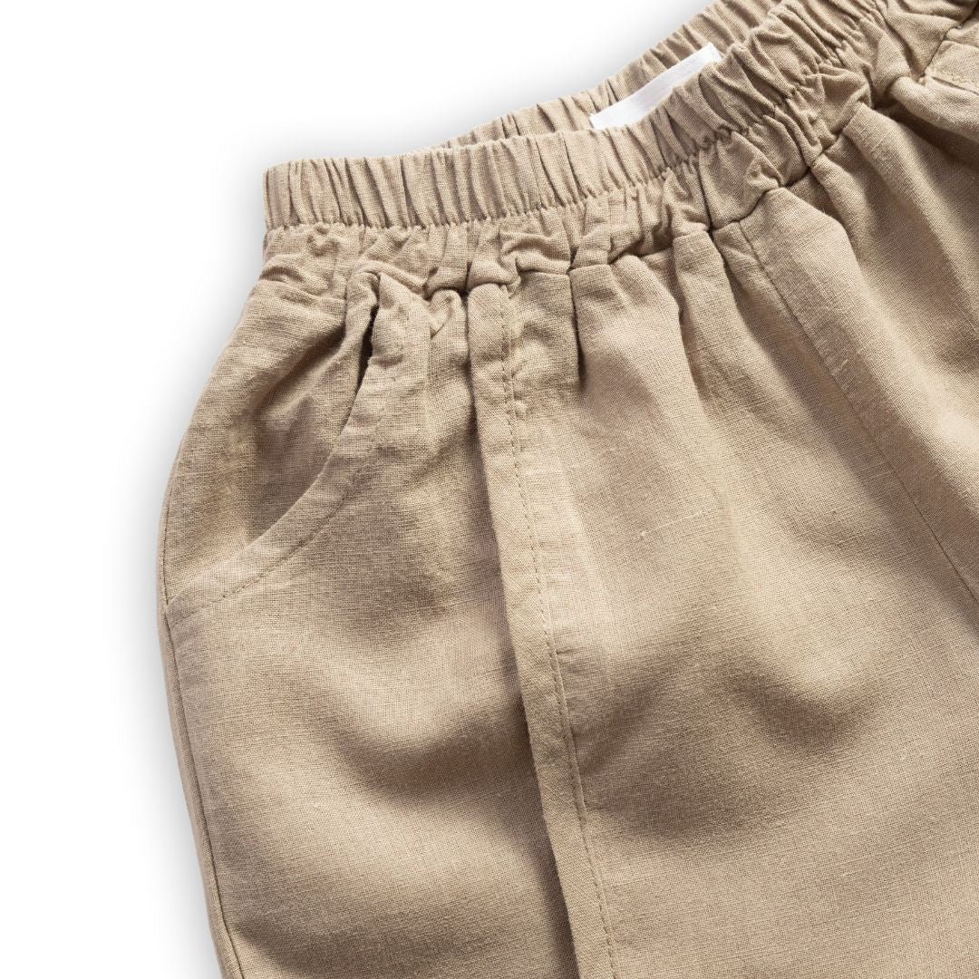 These relaxed-fit trousers are designed with a wider cut through the top for comfort and ease of movement. The elastic waist makes dressing simple, while the soft fawn and earthy green tones bring a clean, elevated look to everyday wear. Ideal for warm days, indoor play, and slow, sunny mornings.