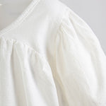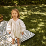 A soft white, long-sleeved romper with a gently gathered silhouette and delicate V-shaped collar. Designed with thoughtful details and a refined feel, it’s a piece made for special days and sweet everyday moments alike. A timeless wardrobe staple for little ones, perfect on its own or layered for cooler weather.