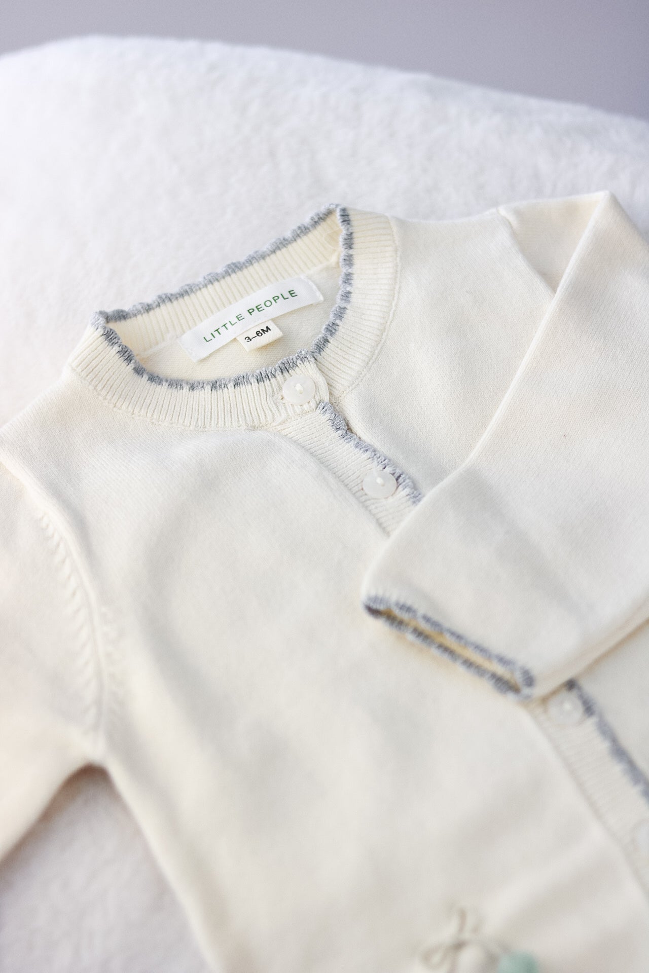 · Lilac rib-stitch at collar, cuffs, ankles, and front opening