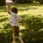 Designed for comfort and everyday play, these summer shorts feature an elastic waist, side opening, and back pockets for little treasures. Made from soft, durable fabric in natural shades of sand, olive, and brown, they pair easily with any top in his warm-weather wardrobe.