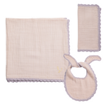 Our Welcome Baby Bundle includes a handmade muslin blanket with delicate crochet trim, a matching bib, and a soft burp cloth — all thoughtfully crafted to wrap your little one in comfort from day one.